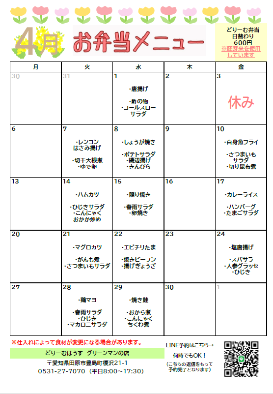 4月のメニューが決まりました!ぜひご予約下さい☆